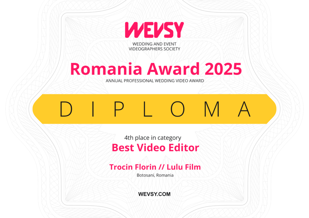 Suntem extrem de bucuroși să vă anunțăm că echipa noastră ,,Lulu Film,, a câștigat trei premii la concursul Wevsy Romania Award 2025, organizat de Societatea Videografilor de Nuntă & Eveniment – wevsy.com:
